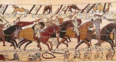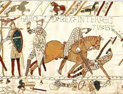 In 1066 the Normans invaded England and defeated the English King Harold at the Battle of Hastings. [Actually the battle took place 6 miles away at Santlache or Sandy Stream. The winning French punned the name to Sanguelac or Blood Lake… but that's another story.] King Harold was killed, supposedly with an arrow to his eye, and William the Conqueror seized power….the rest, as they say, is history.