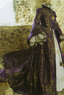 A replica of Mary Tudor's wedding dress.In the Scottish Highlands, to bless a marriage with happiness the best man was supposed to remove the left shoe of the groom at the door of the church and make the sign of the cross on the right side of the door. To this day it is the left shoe that is supposed to be tied to the back of the wedding car as it departs. Also, if a younger sister married before her elder siblings, her sisters should dance barefoot at the wedding or they would never be married. And finally, in northern England it was traditional young men attending the wedding, to pluck the garter from the bride's leg as soon as the ceremony was over. To this end the bride would often was a special, ceremonial garter or ribbon, worn on the lower leg to facilitate its removal and spare her blushes from unwarranted private fumbling.