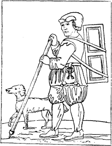 Pedlars, illustrated above, were a common sight in the 1600's.An alternative explanation of the Pedlar's window has also been suggested. This involves one Henry Smith or "Dog Smith" a wealthy London Alderman who died in 1627. At the time he was a well known benefactor to the poor and it was rumored that Henry sometimes dressed in rags to travel in cognito, accompanied by a dog to test out the character of those he was thinking of helping. His would visit a village and beg a bone for the dog and bread for himself. If the villagers turned him away empty handed then he to, declined to give charity to the Parish. Whichever explanation is correct; a story of doggy devotion or eccentric benevolence, this glass window reminds us to this day, of the generosity of the human spirit.