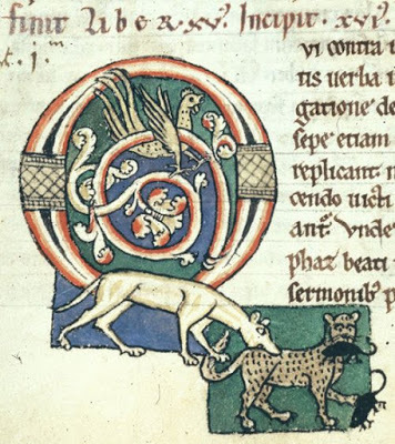 The above shows an illuminated letter “O” taken from a German document dating back to the late 12th century. It shows a dog catching a cat catching a mouse. An allegory perhaps on the nature the predator becoming prey.