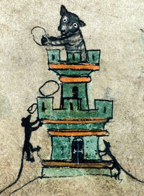 This image is rich with comedic irony, as the cat is assailed by his dinner, the mouse. This cat in his castle dates to around 1320 and a Book of Hours, from London, England.