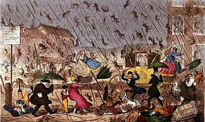 When people emerged from their houses they often found the corpses of these unfortunate strays, washed up in the gutter. This gave the impression that the cats and dogs had actually fallen from the skies along with the rain, and hence gave rise to this expression. It must have been a deeply unpleasant scene, as in this description of a storm by Jonathan Swift, written in1710. “Now from all parts the swelling kennels [gutters] flow, and bear their trophies with them as they go…drowned puppies, stinking sprats, all drenched in mud, dead cats, and turnip tops, come bumbling down the flood.”
