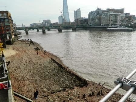 The tidal shore of the Thames, as seen from the Millenium BridgeNote the Shard in the background.The only positive in the dismal picture, it that mud-larking was an early form of recycling. The mud-lark sell scavenged coal to the poor. Whilst the iron, bones, and rope they sold to rag shops. Any tools, such as hammers or saws, they exchanged with seamen for biscuits and meat.