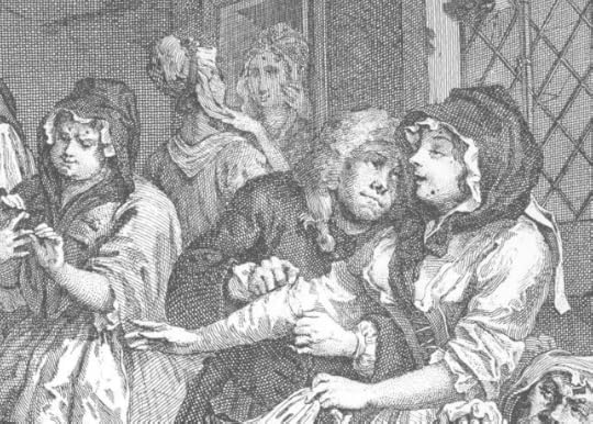 A detail from Hogarth's 'The Harlot's Progress'Society had its own way of dealing with prostitutes, preventing their company from sullying respectable women, by confining them to certain areas. However, it was natural for the prostitutes to seek out trade where it was most likely to be found. Therefore they congregated around taverns, universities, and popular bathing houses, and calling them a herd is perhaps another way of marking them as livestock.