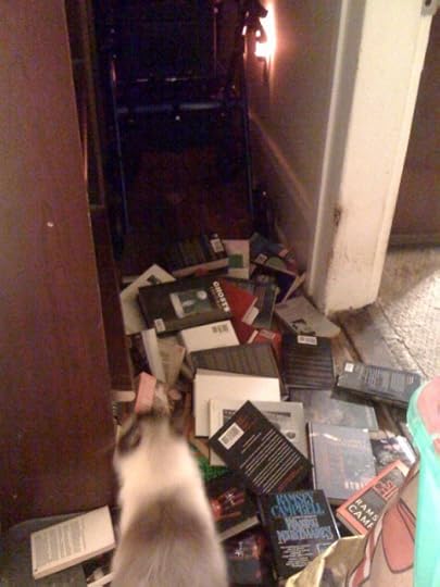 As soon as I read this, I knew I had to post a picture of the shelf collapse disaster that happened earlier tonight. I didn't have the energy to pick them up, so in the background you can see the Jesus nightlight turned on and my walker with a yellow CAUTION: AVALANCHE sign taped to it for when Chris comes home.
