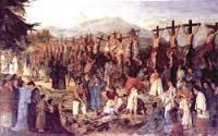 It was almost fifty years from the arrival of Christianity to the time when 26 Christians were arrested in Kyoto and marched 600 miles south and west through the cold and snow of winter, being tortured as they went, to the southern port of Nagasaki, which was the center of Christian influence, and there they were crucified, tied to crosses and speared, as a warning to others.