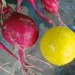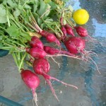 Well, the broccoli seed needed marking. Eventually three or four came up but they won’t mature before frost. But the radishes flourished. I had other things to do so I let them go and when I finally went to look at them – I had beets! Here’s the picture. The biggest is the size of a tennis ball (as illustrated).