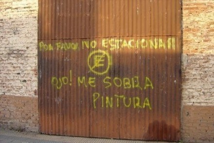 Federico Sfrégola of Buenos Aires sends our first spray-painted sign, which he saw in Rosario, Argentina. It's not exactly empathetic, but it is emotional and, no doubt, effective. Translation: No parking please. Beware! I have more paint.