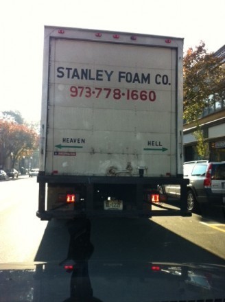 Driving the streets of Morristown, New Jersey, Michele Russo found this one, which instructs drivers how to pass a Stanley Foam truck: