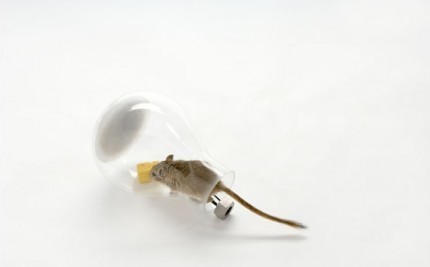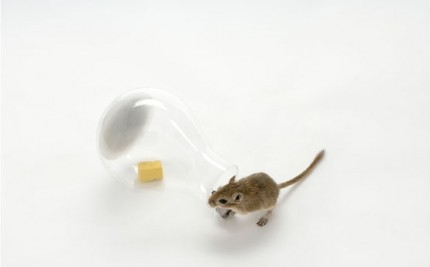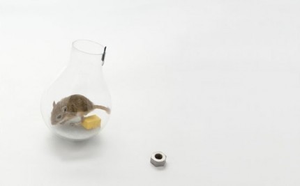 One of his coolest designs he calls Mouse in a Light Bulb. He cuts a large light bulb, lays it on its side, and then inserts a small weight and, natch, a chunk of cheese. When the critter enters, the weight "is released and the light bulb tilts straight up, catching the mouse inside."