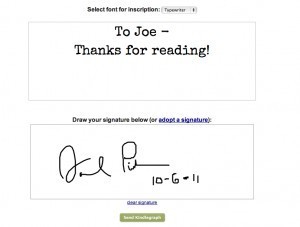 You sign in — for free — with your Twitter account. You look up your favorite book or author. Then you click a button that says "Request Kindlegraph." That sends a note to the author, who then uses her finger and her computer trackpad to "sign" your ebook and zap it to your Kindle. See above for an e-book that I signed a few days ago.