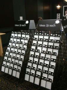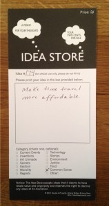 The premise was simple. People who visited a makeshift storefront – think Lucy Van Pelt's psychiatrist office – could fill out a card offering an idea and get paid a penny for it. Robles and Stein then placed the card on the kind of rack you might find at a Hallmark store. Then other visitors could select an idea from the rack and purchase it for two cents.