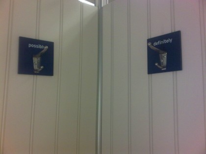 Where to put your clothing in a department store dressing room might not be the most pressing problem that civilization faces right now. But Eileen Boswell sends this solution-through-signage. As you see below, one peg says "POSSIBLY," the other "DEFINITELY."