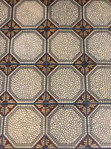 Walking down a corridor of Pennsylvania Hospital in Philadelphia I came across a decorative mosaic panel hanging on the wall. An accompanying label explains that it is a portion of the lobby floor of the Elm Building, which was demolished in 1981 to make room for the building in which I’m standing. The Elm Building was built by the hospital in 1901, a photograph on the hospital website shows an attractive one-story brick and limestone building with a pedimented temple front. Clearly a building of some consequence, it housed administration offices and an assembly room. The unidentified architect took trouble with the lobby floor, and imported the tiles from Germany, the work of Sinziger Mosaikplattenfabrik, located in northern Rhineland-Palatinate. The mosaic pattern replicates ancient Roman tile work. Nice stuff. Increasingly, I am coming to the Hemingwayesque conclusion that a “good building” is simply one that makes you feel good. This piece of saved floor does. The building that replaced it—not so much.