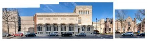 A photograph by New York Times photographer Bruce Buck accompanies an article on the wonderful renovation of the Yale University Art Gallery. The gallery was built in three stages: a tall 1866 Ruskinian Gothic first phase by Peter Bonnett Wight (right); a 1928 Florentine Gothic horizontal portion by Egerton Swartwout; and a 1953 addition by Louis Kahn. What Buck’s photo clearly shows is the insensitivity of Kahn’s addition. It is not a question of style—Swartwout did not follow Wight’s lead either—but of massing. The Swartwout wing was rudely truncated by a brick party wall, and was obviously intended to be completed at some future date. Not only does Kahn not complete the work of his fellow architect, he insensitively pulls back to reveal the utilitarian party wall, leaving Swartwout with his metaphorical pants down. In addition, the cavity along Chapel Street does nothing to balance the composition, and only accentuates the difference between Kahn and Swartwout’s buildings—as it was presumably intended to do.