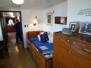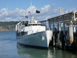 Last week I had the opportunity to sail on San Francisco Bay on the Potomac. The USS Potomac, built as the Coast Guard cutter Electra in 1934, two years later was commissioned as Franklin Delano Roosevelt’s presidential yacht. Roosevelt used it to sail up and own the Potomac until his death in 1945, when the ship was decommissioned. After being decommissioned, the Potomac had a checkered history. She was used as a ferry boat in the Caribbean, was briefly owned by Elvis Presley, was later used for drug smuggling and seized by the Customs Service, and finally ingloriously sank while at anchor at Treasure Island in San Francisco Bay. She is now owned by the Port of Oakland. The restored interior is much as FDR and his many guests, who included George VI and the future Queen Elizabeth, would have known it. The wheelchair-bound President had a rope-powered elevator installed that allowed him to pull himself up to the upper deck, and emerge through a door in the fake second funnel. What is touching is the unpretentiousness of it all; wicker chairs, a modest bunk in FDR’s cabin, and a broad settee in the stern where he could sprawl at presidential ease.