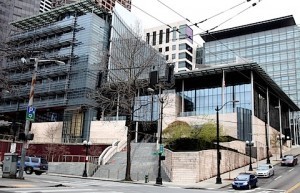 The philosopher Isaiah Berlin wrote a famous essay based on a saying attributed to the ancient Greek poet, Archilochus: “The fox knows many things, but the hedgehog knows one big thing.” Berlin was referring to writers and thinkers—he characterized Plato, Nietzsche, and Proust as hedgehogs, Shakespeare, Goethe, and Pushkin as foxes. I was visiting Seattle this week, and two buildings almost side by side, the Seattle Public Library and the City Hall, reminded me that the metaphor holds true for architects as well. Rem Koolhaas and Joshua Prince-Ramus, the architects of the library, are definite hedgehogs; they have one big idea that they flog for all its worth. Glass, glass, glass. No details, no facades, no relation to the surroundings—the crystalline shape is awkwardly parachuted into steeply sloping site. Peter Bohlin, on the other hand, is a (sly) fox. Instead of a Big Idea, the building addresses its function, its site, its views, its materials, and its construction in many small—and not so small—ways. We have become so used to signature buildings that it is almost surprise to encounter a public building, especially a city hall, that is not trying to be an icon. Unlike the library, this building is neither puzzling nor confusing. Here are the offices, here’s the council chamber, here’s the entrance, here’s a place to sit and have lunch, and here’s how the whole thing is put together. The library is a prickly presence in the city; the city hall flits lightly through its urban surroundings.