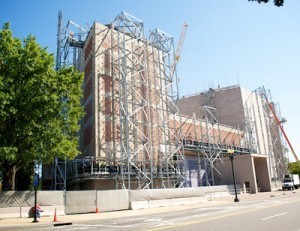 I. M. Pei's East Building of the National Gallery of Art in Washington, D.C. is currently undergoing repairs. The cladding of the 33-year-old building is being entirely re-hung to rectify a problem with the anchors that support the marble slabs, a project that is expected to take four years and cost an astounding $85 million. It's worth taking a look at Pei's denuded building. The familiar triangular prisms turn out to be concrete frames in-filled with brick, quite unlike the effete geometry that we are used to. It is as if a businessman removed his pin-striped suit to reveal a muscle shirt. The robust beams and red brick recall nineteenth-century industrial architecture, a curious but not unwelcome presence on the Mall. It reminded me that Louis Kahn was one of four architects considered by Paul Mellon and Carter Brown (the others were Philip Johnson, Kevin Roche, and Pei). Although Kahn was designing an art museum for Mellon at Yale, he did not get the job. Had he, he might have produced something like the gutsy building that has suddenly appeared on the Mall.