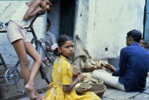 Rolling beedies (Indian smokes) in a slum settlement in Indore, c. 1983 (Photo: Vikram Bhatt)