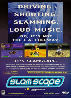 SlamScape for the PS1 is a 3D, behind-your-vehicle shooter set in a surreal world of bomb-throwing ferris wheels, deadly teddy bears, exploding balloons, bottled brains on unicycles, a Scary-Go-Round, a spinning seagull named Gullicopter, a monstrous creation called Crabzilla, and other bizarre enemies.