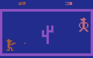 One of the first games designed by David Crane of Activision fame, Outlaw for the Atari 2600 is both a target shooting contest and a shootout game in one cartridge. When playing by yourself, you score points by shooting a moving target. When challenging a friend, the two of you (one gunslinger on the left and one on the right) fire away at each other.