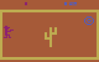 One appealing aspect of Atari VCS cartridges from the late 70s was the number of gameplay variations. Many titles boasted at least 16 different games in one cartridge. While these extra games were generally minor variations on a basic theme, at least it seemed like you were getting more for your money. In Outlaw, the variations are certainly welcome. The difference between shooting through a wall and shooting past a stagecoach is indeed significant in terms of the strategies used for hitting your opponent while avoiding his or her gunfire. Outlaw is an imminently playable game that offers a good amount of enjoyment. Shooting through the obstacles to get to your opponent is a blast. However, when compared Combat, which is the best two-on-two shootout game from the era, it comes up a little short. With its tanks and planes, Combat offers more challenges, variations and excitement.Check out my Atari 2600 book HERE.