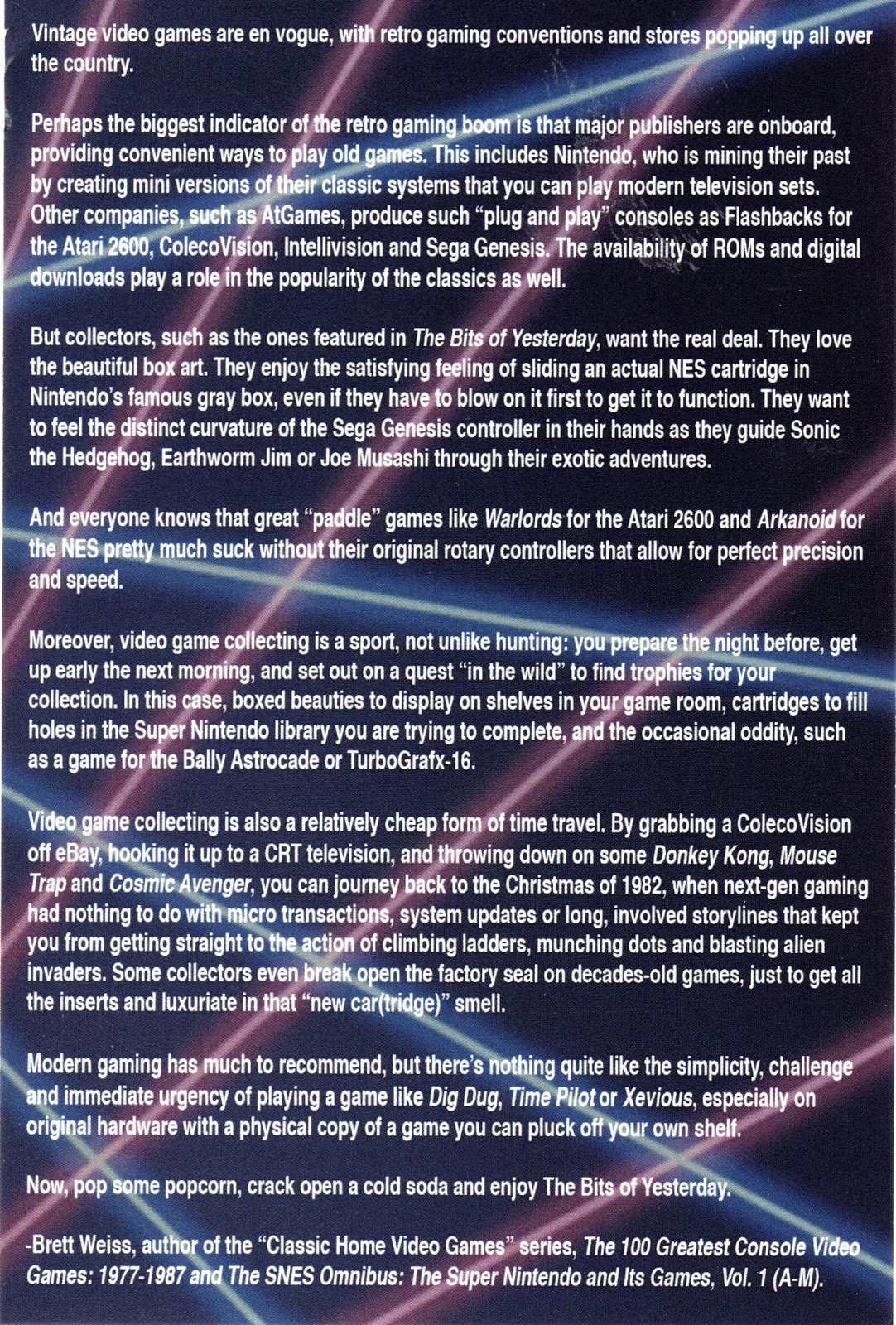 This year I had the distinct honor of writing the forewords to two very cool video game-related projects: The Bits of Yesterday, a documentary on collecting vintage video games featuring such celebs as Pat Contri and James Rolfe, and The Minds Behind the Games, a book featuring interviews with developers of such classics as Mortal Kombat, NBA Jam, and Yars' Revenge. The Bits of Yesterday was directed by Darrin Peloquin while The Minds Behind the Games was authored by Patrick Hickey, Jr. Both are great ambassadors for the retro gaming community.Click on the image to read my foreword to The Bits of Yesterday: