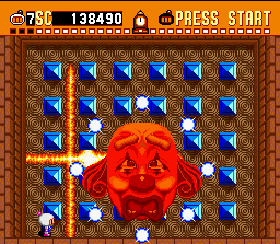 There are 12 selectable battle stages, a.k.a. zones: Normal, Western, Bomb, Jump, Belt, Tunnel, Duel, Flower, Light, Power, Warp, and Speed. Destroying certain walls reveals level exits; exiting through there after all the enemies are destroyed clears the level. In multi-player games, the last surviving player wins. The storyline revolves around the evil Carat Diamond and his cohort, Dr. Mook, who are hosting a Robot Tournament in Diamond City in order to steal BomberMan’s advanced combat abilities. The one-player game is a little too easy this time around, and the graphics remain simplistic, but that’s okay: the multi-player action will keep you and your friends entertained indefinitely.