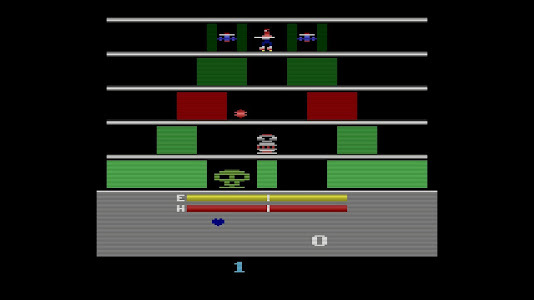 As a lowly TechSpecialist, Grade 3, you embark on a perilous mission to rescue PrincessZyrvanni, who has been captured by malevolent aliens. Equipped with a spacesuit featuring jet boots, an energy defense shield, and a plasma gun, you mustnavigate through a treacherous spaceship filled with aliens, drones, and robotswhile dodging superheated walls and radioactive floors and managing your healthand energy levels. In H.E.R.O., you are equipped with dynamite for demolishingwalls. Here, you trigger bombs that are positioned in various spots throughoutthe levels.