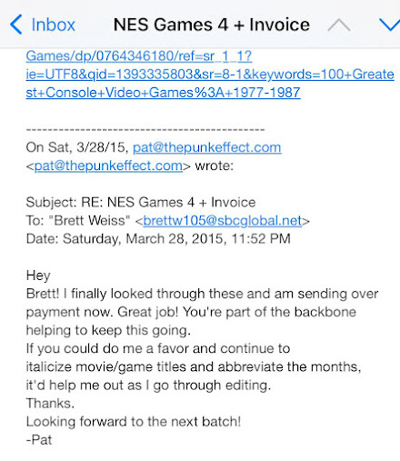 But, as soon as hesaw me as competition instead of a friend and colleague, he started lying aboutme repeatedly on his podcast and calling me names. He said my reviews for his NES book were “garbage” after he deleted them from the THIRD edition. Hebrought me up on his podcast periodically, just to say bad things about me andmy reviews, which is totally strange and disingenuous since he complementedthem repeatedly during the production of the book. (In 2015, he said "great job" and that I was a "backbone" helping keeping it going, as you can see by the email below.) Prior to getting reallynasty, he started ghosting me at conventions and acting uncomfortable around me—butonly after my SNES Omnibus Vol. 1 came out.
