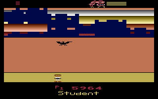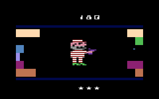 The protagonist issignificantly larger than most characters found in Atari 2600 games. This sizeaspect adds an interesting dynamic but also contributes to the game'simbalance. The prisoner is trapped in a continuously shrinking jail cell, withthe goal being to shoot at the walls to create an escape route before beingcrushed. Conceptually, this setup is engaging and should offer players a tense,strategic challenge. However, the execution leaves much to be desired.