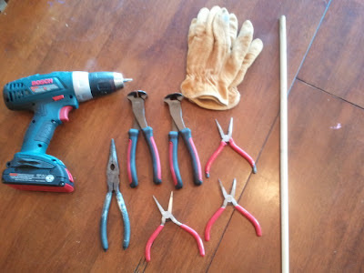 Drill (that will fit the dowel), needle-nose pliers, nippers, gloves,a wooden dowel (mine is just under 1/2")