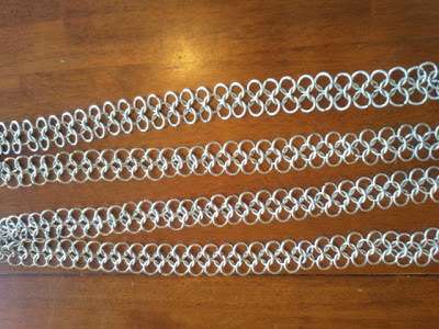 Step (6) - Link the long strands together using open rings. Now you are really getting somewhere! (these are just short strands linked together, fyi.)