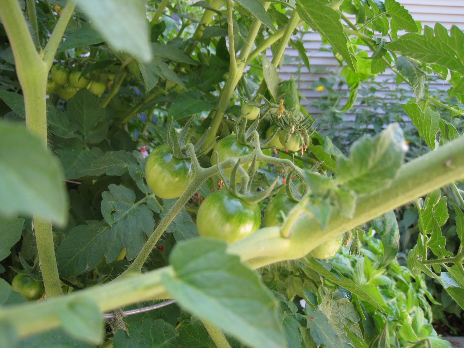 So let me take you on a tour of the garden. First we have little green clusters of cherry tomatoes. I am counting the days until I can harvest these babies, most of which are destined for slow-roasting and freezing so I can taste some sunshine in January.