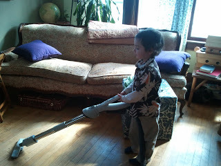 Okay, my sister is awesome and her children have provided me countless hours of entertainment over the last three years, so she totally deserves it. My mother and I made the vacuum delivery this past Sunday. I had grand plans of photographing my niece and nephew posing adorably with the vacuum; unfortunately, Corbeau wouldn't cooperate. Grandma tried to show him how it's done: