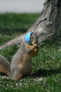 This is not one of our baby squirrels, but one that somehow ended up wearing a plastic Easter egg bonnet near the school my brother teaches at. See? Totally cute!