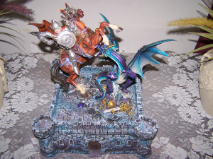 part of my life. I have a fairly large collection of dragon figures, many of which I added when my mother and I went into business together selling stuff at the local trade show. It only lasted a couple of years, but it was fun while it lasted. The best thing about having access to a warehouse full of dragons imported from China (like everything else) was being able to purchase items for my own collection at ridiculously low prices. My favorite (pictured here) is one of a knight battling a dragon that is protecting its treasure. The battle occurs on top of a castle. Concealed within the castle is a complete chess set. The knight and dragon are actually attached to a removable lid that reveals the chessboard underneath.
