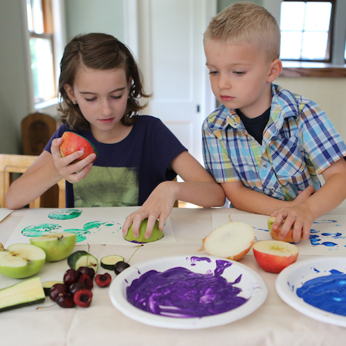 Cut and StampApples make great print blocks. Cut a nice firm apple in half. Use a sturdy plastic knife or popsicle stick to cut away parts of flesh. Pour tempera or finger paint on a sturdy paper plate. Touch the cut apple to this to coat. Then press firmly on paper. Repeat to "stamp" your design all over the paper. If you want more than one color, wash off the apple and pat dry with a paper towel. Then keep on stamping with a new color of paint.