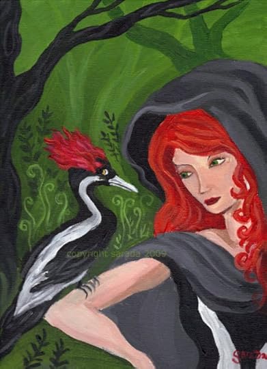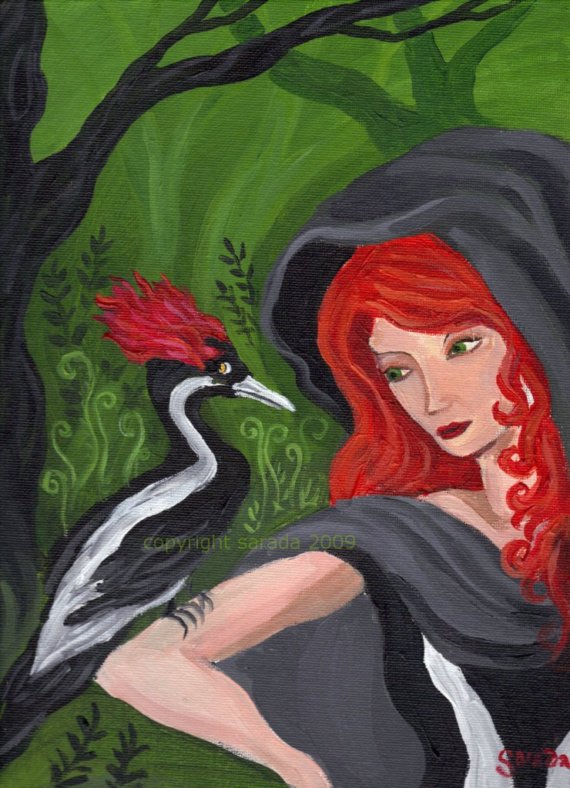 As he walked away, the woman began to change. The black dress she was wearing, her white apron and her bright red hair changed to feathers. She became a woodpecker. To this day, the woodpecker must fly from tree to tree and peck very hard to get food to eat.