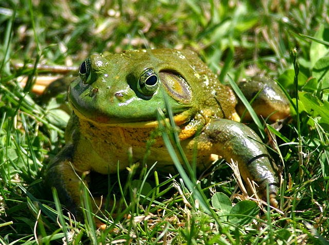 Bull frog.Green and hungry.Sees a fly and snags it.What a master garden insecthunter!