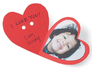 PEEK-A-BOO Card: To make this card, first cut a heart out of folded paper so it's hinged. Have a child glue their photo inside. Then mark the spot where the eyes will be when the heart card is closed. On the side that will be the outside of the card when it's closed, poke holes with a hole punch or a sharp pencil. Finally have the child add a "Guess Who Loves You?" message on the face of the card. And a "It's me, love note" inside.