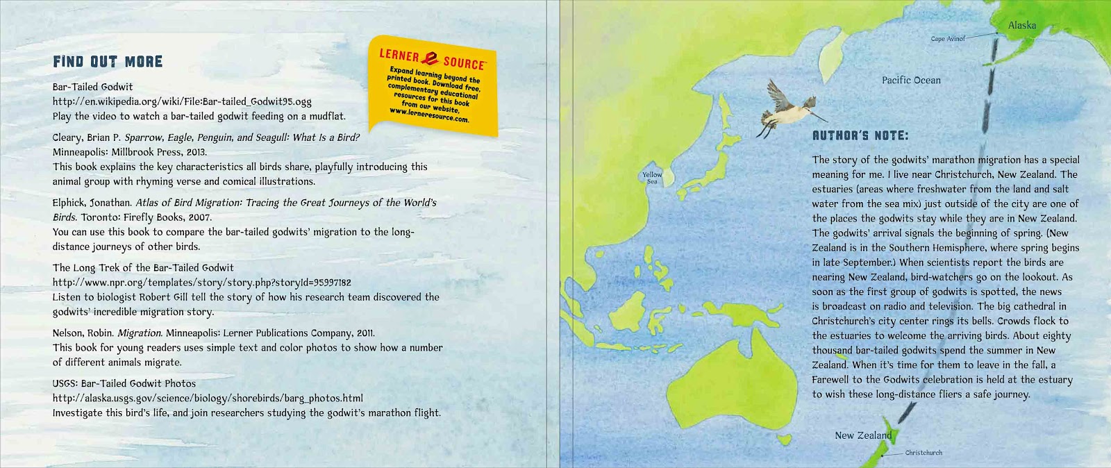 Extra facts: Godwits Are Amazing!Sources of more information: Find Out MoreAnd a personal note from me about what inspired me to write this story and what special things I found out while researching the book: Author's Note