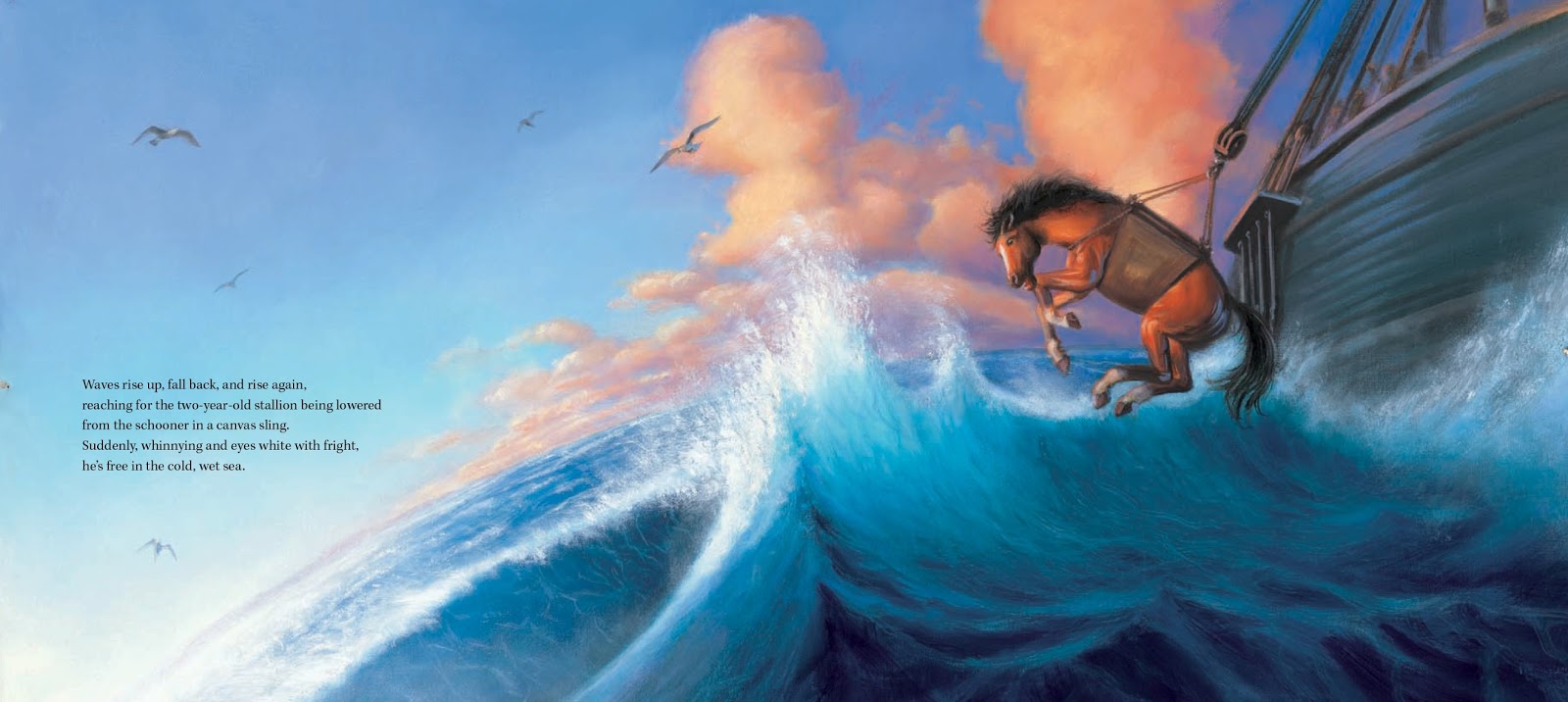 If you'd like to read it aloud yourself,this is the opening spread from RACE THE WILD WIND (Walker).