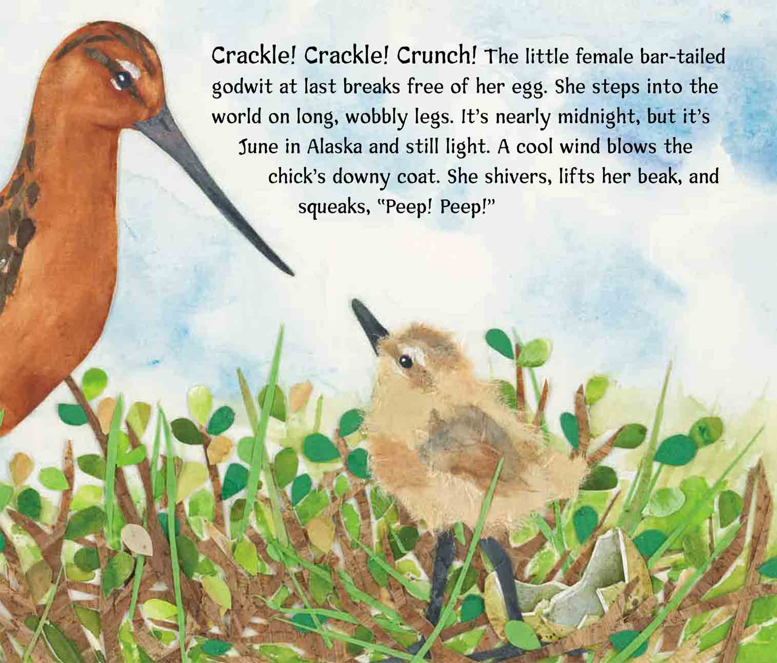 Crackle! Crackle! Crunch! What's hatching from that egg? It's a young bar-tailed godwit. She will spend the summer in Alaska learning to fly, find her own food, and escape from scary predators. Her long, long journey begins in October when she flies to New Zealand. This 7,000-mile flight is the longest nonstop bird migration ever recorded. Follow along on her amazing voyage!
