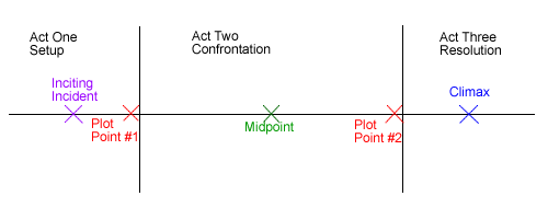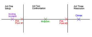 Writing FictionLet's take a closer look at writing fiction for children. Your story clearly needs an interesting plot and characters kids can care about. In today's world, writing a story--whether for children or adults--isn't that much different than writing a movie screenplay. The plot structure is basically the same--the three Act structure. Here's a quick graphic view of that illustrates the structure.
