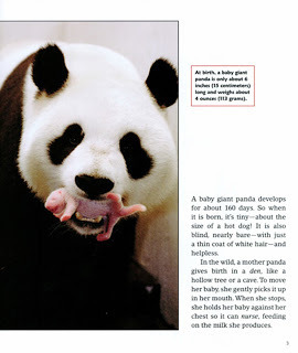 Concept Books--These share an animal's life cycle or a special concept. How Many Baby Pandas (Walker, 2011) shares the Giant Panda's life cycle and presents the concept of why this animal is endangered. It also introduces efforts to protect and expand the population of Giant Pandas.