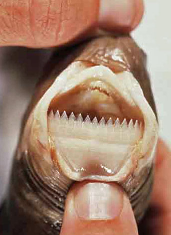 Cookie Cutter Shark takes a bite on pages 10 and 11.A Great White Shark's mouth has five or more rows of teeth. Do all the rows stand up straight or do some of the teeth lie flat?Do Cooke-Cutter Sharks have lower teeth that are different sizes and shapes or are they all the same size?