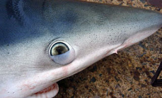 See the nictitating membrane partly covering this blue shark's eye.Some sharks have a special eye membrane, called a nictitating membrane. When the shark gets close to something, such as its prey, this moves over the eye to shield it. Great Whites have a set of muscles that roll the entire eye into its socket to protect it.