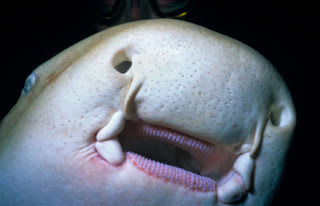 Which sharks that appear in the book have their mouths at the front end of their head? Which have their mouths under a nose?