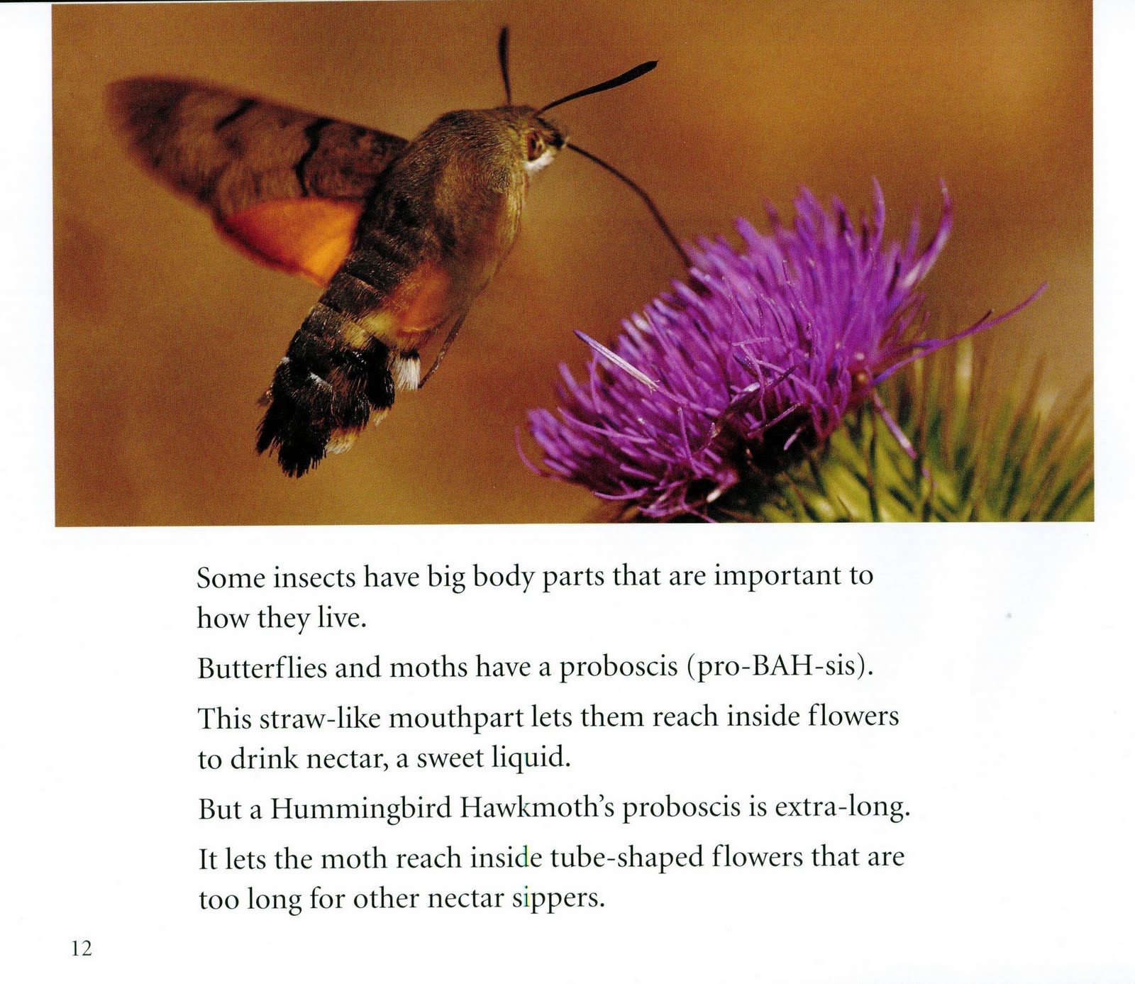 Can you eat like a Hummingbird Hawkmoth? Look on page 12 to see how the Hummingbird Hawkmoth drinks nectar, sweet liquid produced by flowers. How does it help the moth to have an extra-long proboscis, straw-like mouthparts?